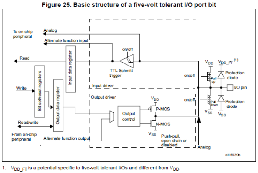 그림 가운데 위쪽(Input driver)은 입력으로 사용되었을때의 신호 처리이다. 입력값이 Analog인 경우 바로 내부 Analog값으로 들어가지만 디지털 신호인 경우 슈밋 트리거를 거친 후 다시 Alternate funtion과 입력 레지스터쪽으로 신호가 처리된다.