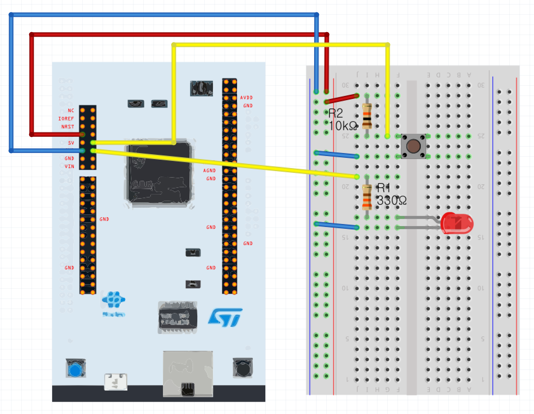 위에서 기술한 바와 같이 STM32의 GPIO핀에는 Pull-up/Pull-down회로가 내장되어 있고 S/W에서 설정으로 이를 활성화시킬 수 있다. 따라서 이 예제에서는 외부에서는 별도 회로를 만들 필요가 없다.