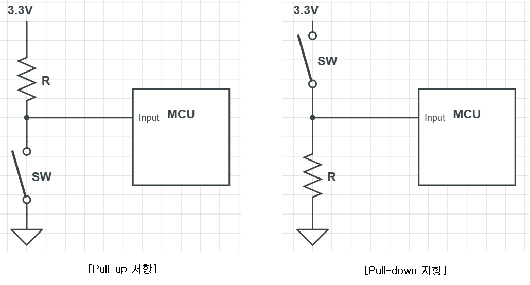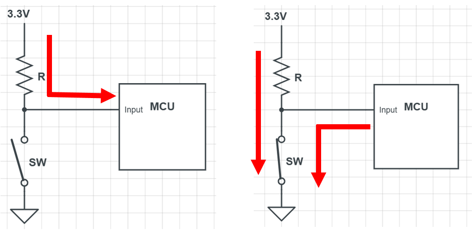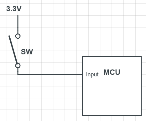 가장 단순히 생각하면 왼쪽 그림과 같을 것이다. 스위치를 누르지 않은 상태에서는 3.3V가 인가되지 않으므로 0, 스위치를 누르면 1상태로...