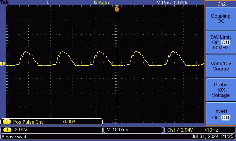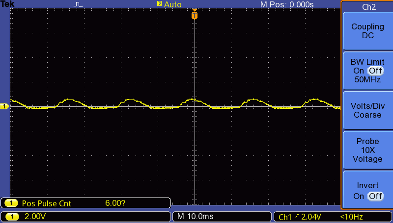 위 그림에서 Floating상태는 진폭이 크지 않지만 상황에 따라 어떻게 될지는 아무도 알 수 없다. 프로브와 연결된 선을 손으로 살짝 잡았더니 아래와 같이 바뀌었다.