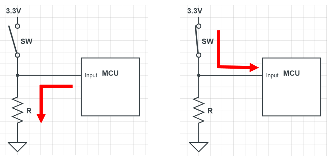 위 [Pull-down Open/Close] 그림의 오른쪽, 즉 스위치가 닫혔을 때 전류는 GND쪽의 Pull-down저항때문에 GND로 흐르지 않고 Input Pin쪽으로 흐른다.