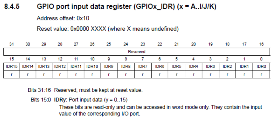 __IO uint32_t IDR; /*!< GPIO port input data register, Address offset: 0x10 */
