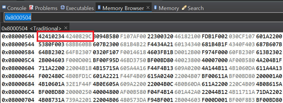 Memory Browser 그림과 같이 r2, r3에 저장하는 주소값이 들어있는 0x0800 0504, 0x0800 0508위치의 메모리 값을 보면 각각 0x4241 0234, 0x4240 829C이다.