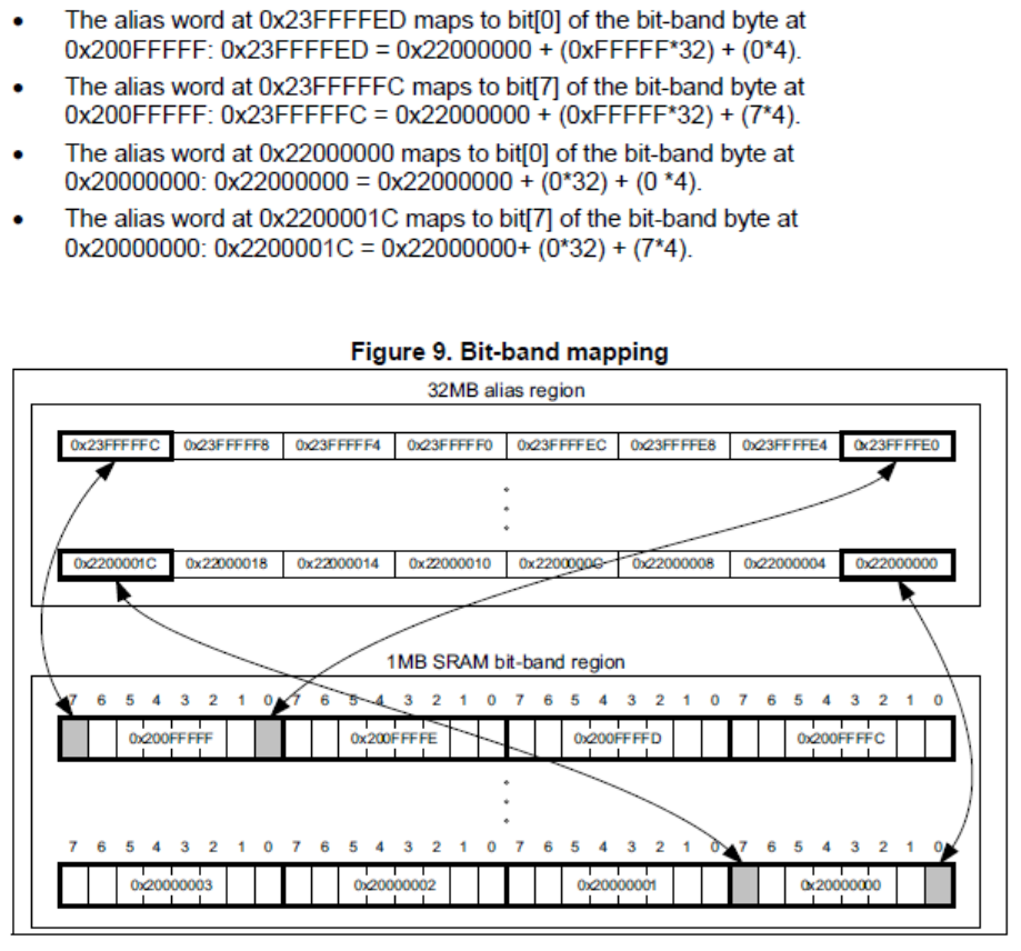 두 표에서 위에 나오는 xxx bit-band region이라고 되어 있는 영역이 원래의 SRAM과 Peripheral Register의 영역이고 아래쪽이 원래 영역에 대한 Alias로 지정된 영역이다.
