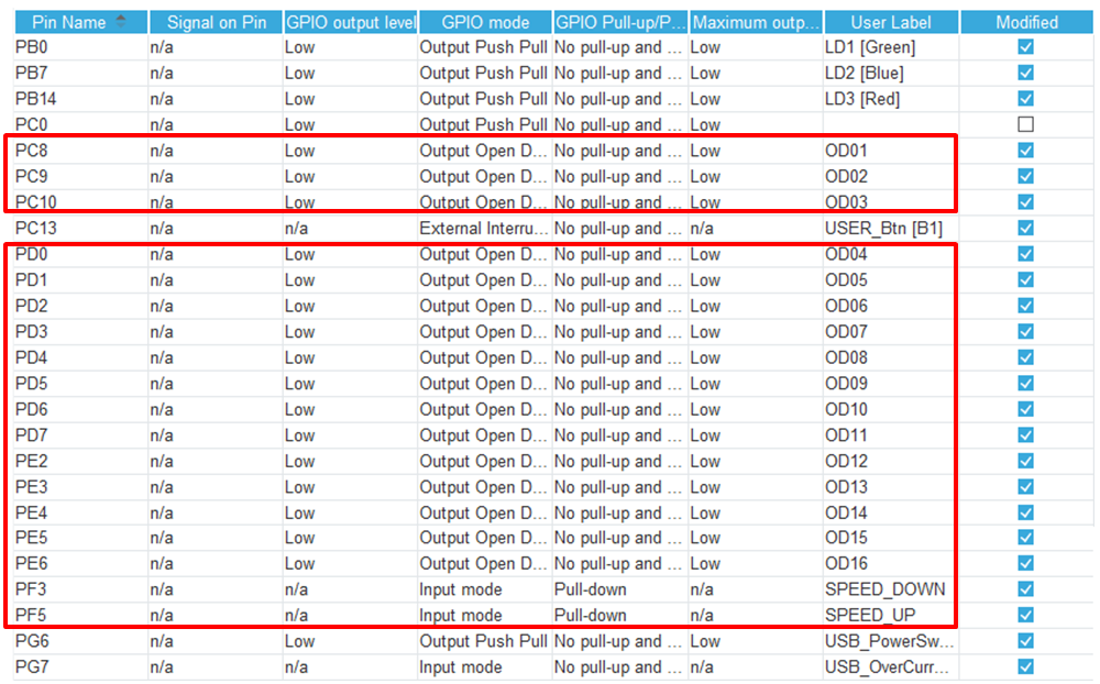 모든 Open Drain Output은 GPIO_Pull-up/Pull-down 항목을 "No pull-up and no pull-down"으로 설정했으며 푸시버튼 Input은 Pull-down으로 설정했다.