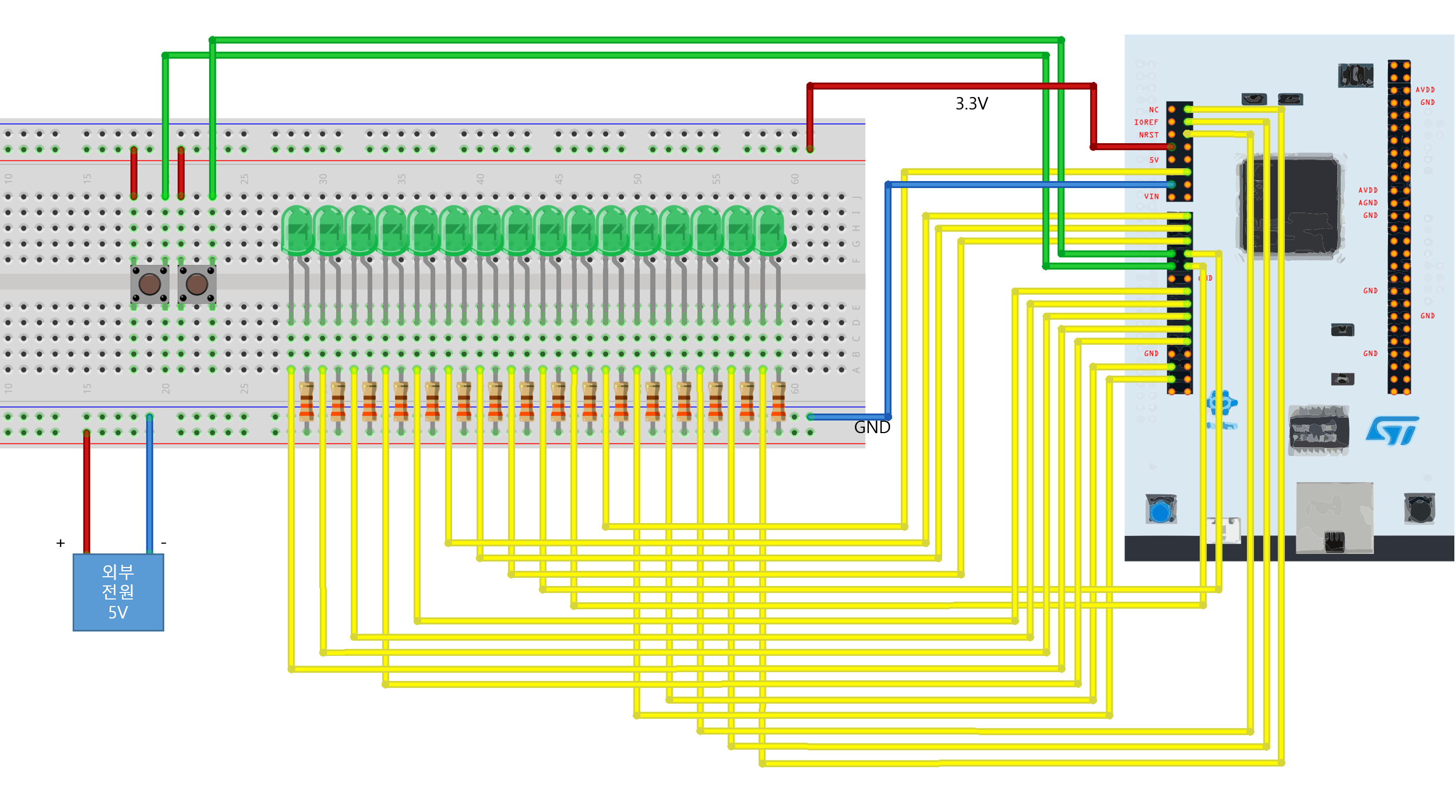 LED는 외부전원에 각각 병렬로 연결되어 있고 330Ω저항을 통해 GPIO핀과 연결된다.